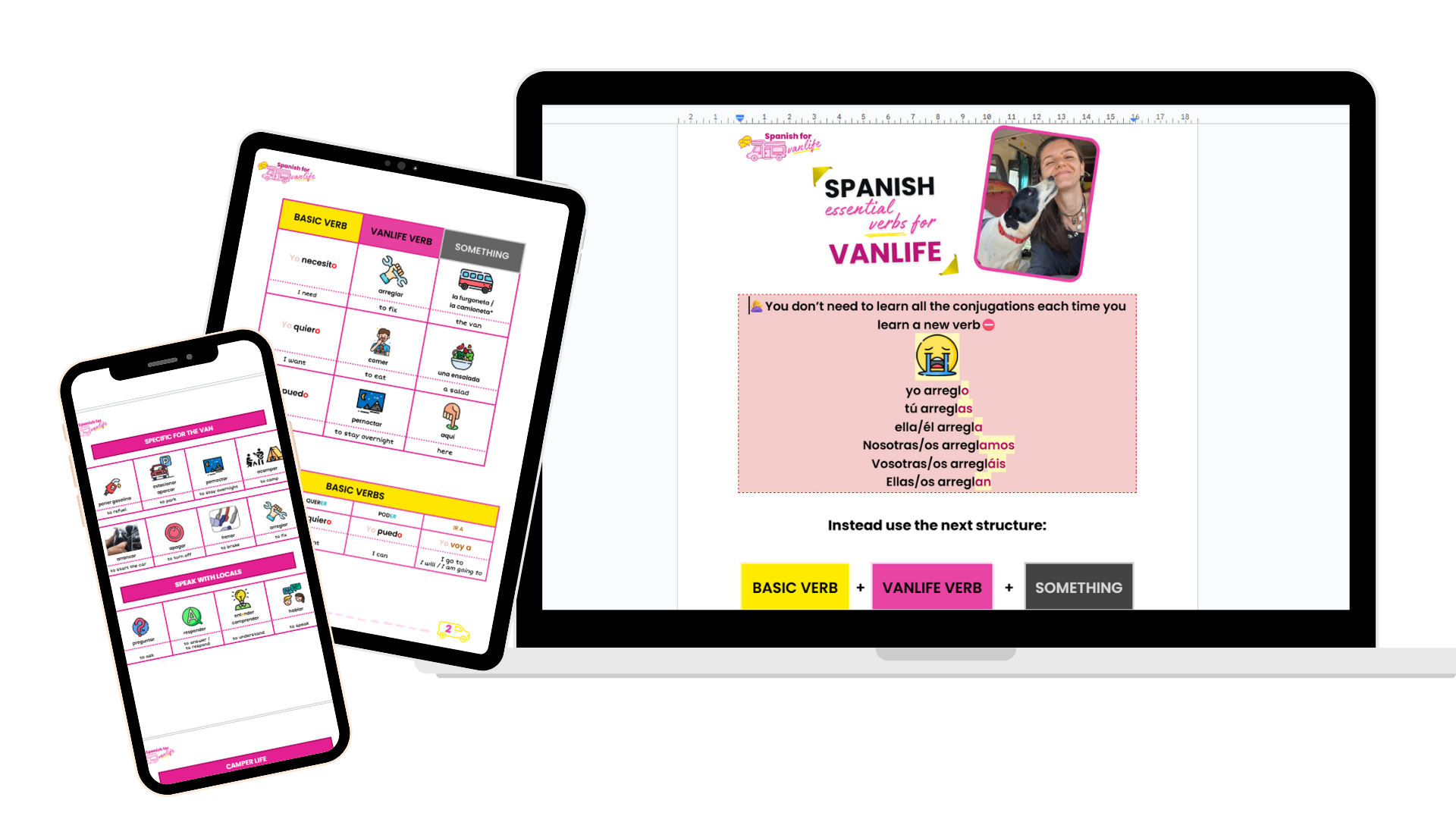 You are a vanlifer and not a tourist, but if you freeze up every time you want to speak Spanish at the campground and end up switching to English That’s simply because you need to know the verbs we vanlifers actually use every day, which are not on Duolingo. ¡VERBOS! Plus, you can start using them right now, because you don’t need to memorize the thousands of conjugations Spanish has. Speak without freezing up because of that damn grammar! ⇣ How many of these verbs do you already know? ⇣ I accept the privacy policy ¡VERBOS, por favor! Loading... The verbs are arriving in your inbox in 3... 2... 1... 🐶 Lovely human, check your spam folder as my human's emails sometimes like to hide there «It’s time your dog isn’t the only one making friends this summer.